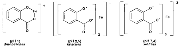 Различную окраску в зависимости от рН среды имеют комплексные соединения иона железа (III) и салицилат-иона: