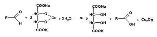 Реакция окисления альдегидов лежит в основе использования реактива Фелинга, представляющего собой смесь от- лельно приготавливаемых растворов сульфата меди и калий-натриевой соли винной кислоты. В щелочной среде при нагревании в присутствии альдегидов образуется красный осадок оксида меди (I). Общая схема этой реакции: