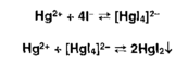 При титровании йодидов конечную точку титрования устанавливают по выпадению красного осадка йодида ртути (II) вследствие разрушения образующегося при титровании тетрайодомеркурат-иона: