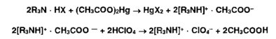 Соли органических оснований с галогеноводородными кислотами (ЯзЫ • НХ) проявляют кислотные свойства даже в неводной среде. Поэтому их титруют в присутствии ацетата ртути (II), который нейтрализует галогенпроизводную кислоту. Малодиссоциированные галогениды ртути (HgX2) и (СНзСОО)г^ не мешают определению. Образующийся ацетат органического основания оттитровывают хлорной кислотой: