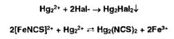 Меркурометрия — метод определения галогенидов, образующих малорастворимые соединения с катионами ртути (I). Титрантом служит раствор Ь^г^Оз):, индикатор — тиоцианат железа, который обесцвечивается в точке эквивалентности вследствие образования тиоцианата ртути (I):