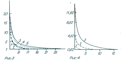 Рис. 3. Кривые динамики скорости фильтрации сывороток плацентарной крови человека через мембраны «Мифил». 1- «Дюрапор »; 2 — GS; З — «Мифил»; 4 — «Сарториус »; 5 — МФА-1. Здесь и на рис. 2 по оси абсцисс τ (в с), по оси ординат — υ(в мл). Рис. 4. Кривые динамики скорости фильтрации сывороток плацентарной крови человека через мембраны «Мифил». Концентрация сывороток: 1 — 100 %. 2 —20 %. Э — 10%.