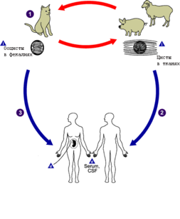 Toxoplasma gondii относится к кишечным кокцидиям; кошки служат как окончательным, так и промежуточным объектом паразитирования. Фактически, кошки - единственные животные, выделяющие ооцисты с испражнениями. При первичном заражении инфекция у животных протекает асимптомно и серонегативно. При этом они могут выделять с экскрементами до 20 млн. неспорулированных (т.е. неинфекционных) ооцист в день, однако, данное состояние длится только 10–15 дней с момента инфицирования, а после первичного заражения у животных развивается иммунитет, предохраняющий их от повторного заражения. Споруляция, переводящая ооцисты в инфекционное состояние, происходит в последующие 1–5 дней (при температуре 24°С); она не реализуется при температуре ниже 4°С и выше 37°С. Сроки появления ооцист в испражнениях кошки зависят от характера инфицирования и составляют от 3-х до 24-х дней. При благоприятных условиях они жизнеспособны в течение 18 мес.