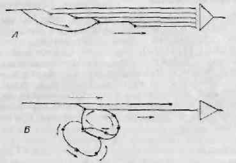 Фиг. 1. Два основных вида цепей в центральной нервной системе. А. Открытая (множественная) цепь. В. Замкнутая цепь (реверберирующий контур). Второй контур на фиг. Б (тонкие линии) иллюстрирует возможность взаимодействия многих цепей и поддержание активности в течение значительного времени.