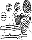 | 1 - клубочек; 2 - проксимальный извитой каналец; 3 - нисходящая часть петли нефрона; 4 - восходящая часть петли нефрона; 5 - дистальный извитой каналец; б - собирательная трубка. В кружочках дана схема строения эпителия в различных частях нефрона |