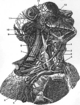 1-щитовидная вена; 2-обшая сонная артерия; 3-передняя яремная вена; 4-подключичная вена; 5-подмышечная вена; 6-лате-ральная подкожная вена руки; 7-внутренняя яремная вена; 8-мышца, поднимающая лопатку; 9-лицевая вена; 10-наружная яремная вена; 11-задняя ушная вена; 12-поверхностная височная вена; 13-угловая вена.