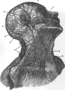 Рисунок 3. Поверхностные вены головы и шеи. Вид справа. 1-наружная яремная вена; 2-затылочная вена; 3-занижнечелюстная вена; 4-задняя ушная вена; 5-поверхностная височная вена; 6-поперечная вена лица; 7-угловая вена; 8-передняя яремная вена; 9-подкожная мышца шеи.