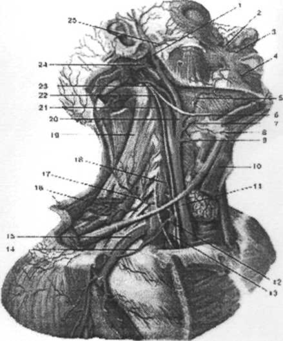 1-поверхностная височная артерия; 2-угловая артерия; 3-верхняя губная артерия; 4-нижняя губная артерия; 5-лицевая артерия; 6-подъязычный нерв; 7-язычная артерия; 8-подъязычная кость; 9-верхняя щитовидная артерия; 10-грудино-подъязычная мышца; 11-правая общая сонная артерия; 12-щито-шейный ствол; 13-подключичная артерия (предлестничная часть); 14-надлопаточная артерия; 15-подключичная артерия; 16-поперечная артерия шеи; 17-поверхностная шейная артерия; 18-восходящая артерия шеи; 19-мышца, поднимающая лопатку; 20-наружная сонная артерия; 21-внугренняя сонная артерия; 22-блуждающий нерв; 23-затылочная артерия; 24-задняя ушная артерия; 25-поперечная артерия лица.