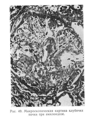 Гистохимические и электронно-микроскопические исследования ткани почек, полученной при помощи пункционной биопсии, показали, что в относительно ранней стадии амилоидной дистрофии поражаются не все петли клубочка. Стенки пораженных петель неравномерно утолщены. В более поздней стадии амилоидная субстанция наводняет весь клубочек, закрывая просвет капилляров, откладывается в стенке артериол, вокруг них, а также в базальной мембране канальцев и в интерстициальной ткани. Нефроны запустевают и атрофируются, в мозговом и корковом веществе разрастается интерстициальная ткань (рис. 49),