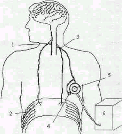 1 - диафрагмальный нерв; 2 - диафрагма; 3 - электроды; 4 - приемная часть; 5 - излучающая антенна; 6 - стимулятор