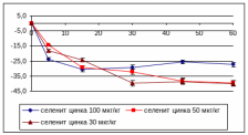 Внутрибрюшинное введение селенита натрия и селенита цинка в дозе 100 мкг/кг (6 опытов) не вызывало достоверного изменения АД по сравнению с исходным уровнем у бодрствующих животных в течение всего срока наблюдения. Однако необходимо отметить, что при введении селенита натрия отмечалась некоторая тенденция к снижению АД на 6%, а при введении селенита цинка - незначительное увеличение АД в среднем на 6%.
