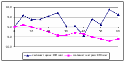 При введении селенита цинка в дозе 100 мкг/кг (8 опытов) выраженный вазоконстрикторный эффект наступал с первых минут наблюдения, при этом степень снижения МК к концу наблюдения была ниже, чем при введении селенита цинка в дозах 30 и 50 мкг/кг. Так, на 5 минуте наблюдения отмечалось достоверное снижение МК на 24,0±18,3%. Наиболее выраженная вазоконстрикторная реакция наблюдалась на 15 минуте, когда МК был в среднем на 30,7% ниже исходного уровня. В дальнейшем величина МК не изменялась (таблица 8).