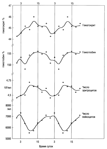 Так, например, известно, что содержание эритроцитов в крови также значительно колеблется в течение суток. Механизмы, регулирующие эти процессы, недостаточно изучены.