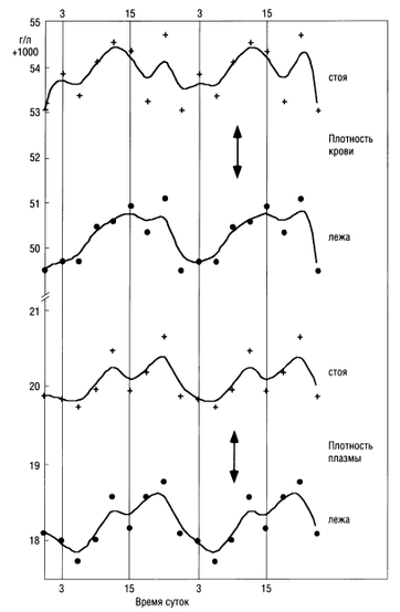 характеристики крови также подвержены выраженным суточным колебаниям. Оба параметра (плотность крови и плазмы) увеличиваются в первой половине дня в эргофазе, снижаясь в трофофазе ранним утром, проявляя хорошо известную ночную гидремию крови. Обращает на себя внимание выраженная корреляция суточных ритмов с периодикой измерений в положении стоя.