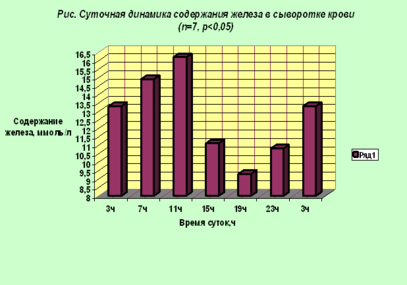Содержание железа в сыворотке было наибольшим в утренние часы (между 6-ю и 12-ю часами); в течение дня (между 13-ю и 19-ю часами) происходило снижение его содержания до минимального значения, а начиная с 19-ти часов вечера и всю ночь, уровень железа в сыворотке крови постепенно повышался.