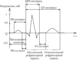 Изменение потенциалов возбужденных клеток приводит к изменению распределения потенциала на поверхности тела пациента. Разность потенциалов между двумя точками изменяется во времени и составляет сигнал электрокардиограммы, изображенный на рис.1. Возбудимость проводящей системы сердца и сократительного миокарда меняется в различные периоды сердечного цикла. В частности, во время систолы клетки сердца не возбуждаются, поскольку невосприимчивы к раздражению.