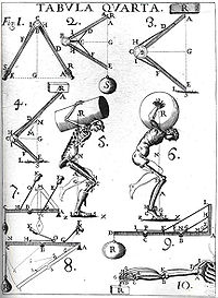 Рисунок из книги Дж. Борелли De motu animalium Система рычагов, схема прикрепления мышц при сгибании в суставе и при разгибании. Скелетно-мышечная схема двух человек, по-разному удерживающих различный груз.