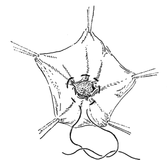 Наложение кисетного шва на шейку полностью выделенного грыжевого мешка с целью его последующей инвагинации (без резекции)