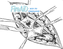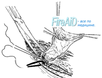В случае, когда возникает необходимое:: во вскрытии грыжевого мешка, он растягивается между двумя зажимами, а стенка надсекается. Для того, чтобы убедится в отсутствии содержимого в мешке необходимо видеть, что бранши ножниц просвечивают через его стенку.