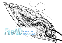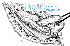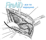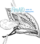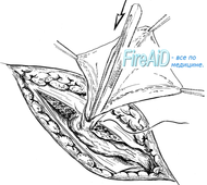 Производится продольный разрез апоневроза наружной косой мышцы живота по ходу его волокон на протяжении 6 - 8 см.