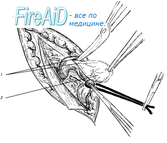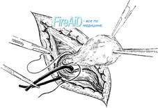 Тупым путем обходится и берется на держалку семенной канатик. Выделение канатика удобнее проводить максимально медиально, в области наружного отверстия пахового канала. Семенной канатик отводится кверху и кнаружи. Производя тракцию канатика за держалку, ножницами или электорокоагулятором пересекаются волокна m. cremaster до внутреннего отверстия пахового канала.