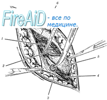 1 - проекция на кожу глубокого пахового кольца; 2 - паховая складка; 3 проекция на кожу поверхностного пахового кольца; 4 - кожный разрез