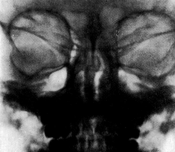 Наблюдение: ебенок Т.,6 лет, заболел внезапно. Температура 38.5°. Объективно: краснота и отек век левого глаза. Главная щель сужена (рис. 1). Со стороны главного яблока отмечается отек конъюнктивы; роговица и среды прозрачны, главное дно нормально. Гной в среднем ходе носа. Нf рентгенограмме - левосторонний этмоидит (рис. 2) Под влиянием консервативного лечения (тепло и носовые турунды из кокаин-адреналина) нос очищается и все патологические явления со стороны левого глаза ликвидируются.
