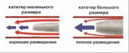 При введении растворов с большой скоростью или введении препаратов с раздражающим действием на сосуд для постановки периферического венозного катетера следует выбирать крупные проходимые вены с хорошим кровотоком. Чем меньше диаметр катетера, тем лучше кровоток вокруг него и, следовательно, выше разведение препарата кровью. Канюли большого диаметра могут закрыть просвет вены или повредить её внутреннюю оболочку (рис.2).