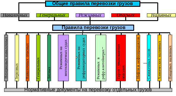 Для разработки комплексной системы нормирования технологии перевозки все грузы разбиты на пять видов: навалочные, генеральные, режимные, опасные и наливные. Комплексная система нормирования технологии перевозки грузов может быть представлена в таком виде: