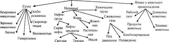 Транспортная классификация охватывает всю номенклатуру предъявляемых к перевозке грузов. Она учитывает различные требования организации транспортного и перегрузочного процессов. Признаки общности, по которым можно объединить различные группы грузов, очень разнообразны, поэтому существует несколько видов классификации грузов. Транспортная классификация может быть представлена в виде схемы: