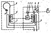 Первичный преобразователь 7 измерительный прибор 5 соединяются методу собой четырехжильным кабелем так, что обмотки возбуждения соединены последовательно и питаются переменным током 28 В, 50 Гц. Вторичные обмотки катушек включены встречно через электронный усилитель 2. Индуктируемая в преобразователе ЭДС равна