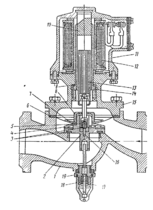 В исходном положении, когда электромагнит не включен в сеть, разгрузочное отверстие 16 основного золотника 2 перекрыто резиновым вкладышем, завулканизированным в разгрузочном золотнике 5. Основной проход вентиля закрыт. Рабочая среда, подаваемая на основной золотник, прижимает его резиновыми уплотнительным вкладышем 3 к седлу корпуса, обеспечивая герметичность затвора вентиля. При этом через кольцевую щель между золотником 2 и шайбой 4 и дальше через отверстие в золотнике и накидной гайке 8 газ попадает в надмембранную полость. В таком положение с обеих сторон, т.е. мембрана разгружена.