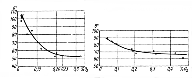 ис.1. Влияние окисленности жидкого металла на краевой угол смачивания: