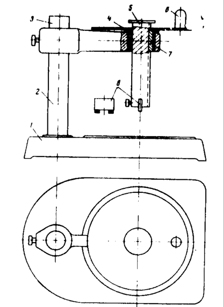 Новый прибор для определения удаляемости пригара с поверхности отливок представлен на рис.1.Прибор состоит из основания 1,на которое устанавливается испытуемый образец, стойки 2 и кронштейна 3. В отверстии кронштейна вращается бронзовая втулка 4 со шпонкой 7. Внутри втулки свободно передвигается по шпонке валик 5, на нижнем конце которого закрепляются две щетки 8, изготовленные из проволоки кордной ленты. Валик щетками опирается на поверхность образца под действием силы тяжести. При вращении втулки за рукоятку 6 щетки передвигаются и счищают пригар с кольцеобразного участка поверхности отливки. Для эффективного удаления пригара рукоятка прибора поворачивается попеременно в ту или другую сторону. Так как сила прижима щетки к поверхности отливки, количество и длина проволок щетки, а также площадь, очищаемая от пригара, - величина постоянные, количество «проходов» щетки может служить мерилом относительной оценки удаляемости пригара. Момент окончания процесса удаления пригара в первоначально изготовленном приборе определялся визуально. Прибор показал достаточную чувствительность и повторяемость результатов.