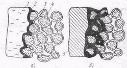 осле заливки формы поверхность отливки 1 покрывается слоем 2 окислов и силикатов железа (рис. 6, а: 3 — зерна кварца, 4 — пленка крепителя). Скорость окисления стали в первый момент после затвердевания отливки 5 (рис.10, б) при наличии в порах формы большого количества свободного кислорода велика (рис.10) [14], образующийся окисный расплав накапливается в граничной поверхности, увеличивая относительную площадь контакта отливки и формы. Часть расплава проникает в глубь формы между зернами песка, образуя и связывая корку пригара с отливкой (см. рис.10, б). В дальнейшем окисление поверхности отливки резко замедляется вследствие уменьшения окислительной способности газов в форме и снижения температуры металла, скорость образования нового окисного расплава на граничной поверхности становится меньше скорости его миграции в глубь формовочной смеси, и между отливкой и формой или стержнем возникает зазор (см. рис.10, б). При этом относительная площадь контакта металла с формой уменьшается. Ширина зазора слагается из толщины окисленного слоя металла и величины растворенного окислами по-