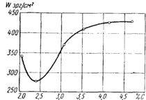 Рис.12. Работа адгезии расплава силиката натрия к твердым металла в зависимости от содержания углерода в сплавах Fe—C