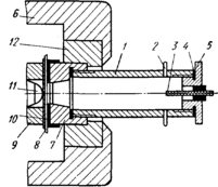 В качестве одного из таких методов можно предложить метод определения прочности сцепления эмалевого покрытия с металлом, описанный в работе [7]. Измерения могут быть осуществлены при помощи простой приставки к прибору типа ПТЛ (рис.13) для испытания листового металла выдавливанием.