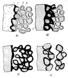 бразование химического пригара представляется следующим образом. После заливки формы поверхность отливки 1 покрывается слоем 2 окислов и силикатов железа (рис. 1, а: 3 - зерна кварца, 4 - пленка крепителя). Скорость окисления стали в первый момент после затвердевания отливки 5 (рис. 1, б) при наличии в порах формы большого количества свободного кислорода велика, образующийся окисный расплав накапливается в граничной поверхности, увеличивая относительную площадь контакта отливки и формы. Часть расплава проникает в глубь формы между зернами песка, образуя и связывая корку пригара с отливкой (см. рис. 1, б). В дальнейшем окисление поверхности отливки резко замедляется вследствие уменьшения окислительной способности газов в форме и снижения температуры металла, скорость образования нового окисного расплава на граничной поверхности становится меньше скорости его миграции в глубь формовочной смеси, и между отливкой и формой возникает зазор (см. рис. 1, в). При этом относительная площадь контакта металла с формой уменьшается.2. Влияние технологических факторов на пригар