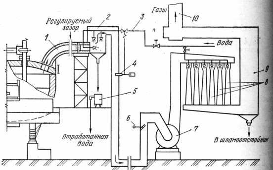Печные газы через отверстие в своде по футерованному патрубку 1 поступают в скруббер-охладитель 2; перед скруббером имеется регулируемый зазор, через который подсасывается воздух, обеспечивающий дожигание горючих компонентов аза. В скруббере 2 газ охлаждается водой, подаваемой через форсунки от водопроводной сети 3. отработанная вода собирается в баке 5. расход воды регулируют, обеспечивая охлаждение газов до температуры менее 200 С; температуру газов измеряют термопарой 4, установленной в вертикальном газопроводе. Далее газы через регулирующую заслонку 6 дымососом 7 подаются в батарею труб Вентури 8 с водяными форсунками, где пыль поглощается каплями воды. После прохождения циклонного каплеуловителя 9 газы выбрасываются в атмосферу через выхлопную шахту 10.
