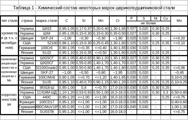 В таблице 1 приводится химический состав некоторых марок шарикоподшипниковой стали: хромистой, хромомарганцевокремнистой и коррозионностойкой; для сравнения также указаны марки некоторых зарубежных производителей.