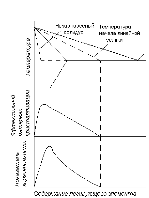 Примеси воздействуют на горячеломкость главным образом через изменение пластичности. Они могут расширить и сузить интервал хрупкости, увеличить и уменьшить относительное удлинение в нём. На развитии линейной усадки в интервале кристаллизации примеси обычно не сказываются.