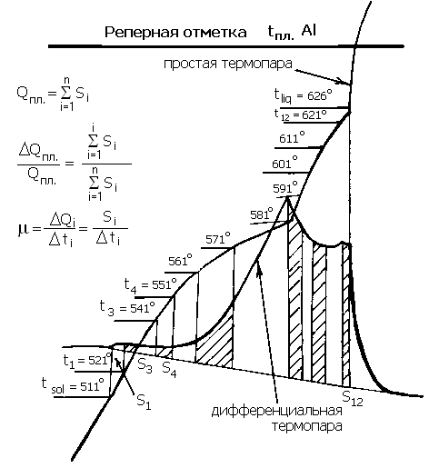 получены при ДТА (рис.17). Под относительной теплотой понимается процентное отношение теплоты, поглощённой к моменту достижения в образце температуры ti(Qi), к общему количеству теплоты, поглощённому при расплавлении образца (Qпл.). Относительная теплота Q/ Qпл. определялась из отношения площади, описанной дифференциальной кривой к моменту достижения температуры ti(ni=1 Si) и площади, описанной дифференциальной кривой при полном расплавлении образца (достижение температуры tliq) (ni=1 Si). Под темпом плавления понималось отношение изменения теплоты (Qi), поглощённой в интервале температур, к величине этого интервала. Для упрощения расчётов величина ti выбиралась постоянной и составляла 10 C. По полученным результатам были построены температурные зависимости изменения относительной теплоты и темпа плавления, которые можно интерпретировать как кинетику образования жидкой фазы в кокильном образце при его расплавлении или как кинетику выделения твёрдой фазы при затвердевании сплава в условиях литья в кокиль. Именно этими данными и следует руководствоваться в процессе проверки результатов исследования вышеуказанных сплавов методом кольцевой пробы.