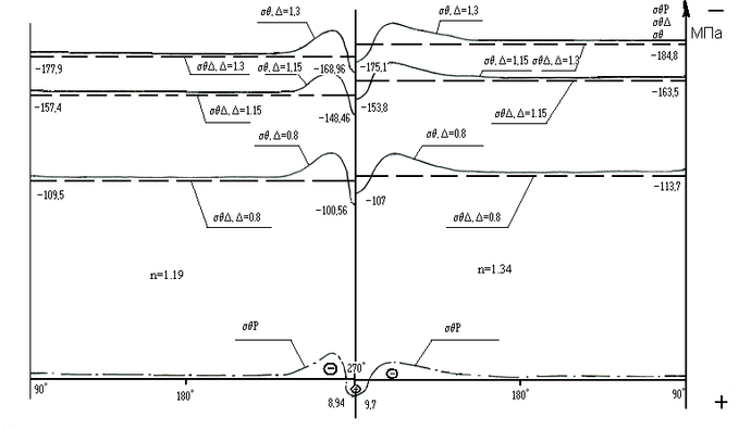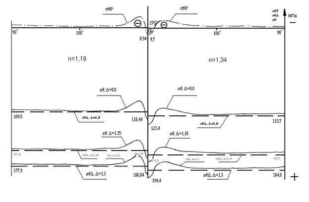 | Напряжение в бандаже, Мпа | раст=146,1 | раст=210,1 | раст=237,5 | раст=129,2 | раст=185,8 | раст=210 | ||||||||||||