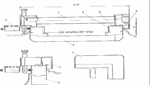 При замене крышек их подгоняют по блоку индивидуально, а гнезда подшипников растачивают с одной установки. При подгонке, являющейся ответственной и трудоемкой операцией, демонтируют коленчатый вал и все вкладыши коренных подшипников, а в гнезда подшипников укладывают фальшвал длиной на три опоры, диаметром 242_о,озмм. Первоначально проверяют места соединения блока с крышкой при помощи приспособления (рис. 5). За исходную принимают поверхность Б обоих замков постели. Прилегание к ней проверяют по краске, оно должно быть равномерным и занимать не менее 80 % площади. При необходимости производят шабровку поверхности Б. Непараллельность поверхностей А и В определяют измерением микрометром каждого замка блока по размеру "62" со стороны генератора и со стороны отсека управления. Разность двух замеров не должна превышать 0,01 мм. Для проверки неперпендикулярности поверхности В к поверхности Б вплотную к ней на блок устанавливают угольник 5 и щупом измеряют зазор между поверхностью Б и угольником. Так же проверяют неперпендикулярность поверхности А. Измеренный щупом зазор, показывающий неперпендикулярность, должен быть не более 0,03 мм на длине 60 мм.