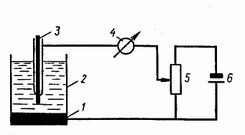 1 — анод (слой ртути на дне ячейки); 2— электролит; 3 — катод (ртутный капельный электрод); 4 — микроамперметр; 5 — реостат; 6— источник питания