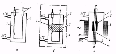 В ячейке (рис. 3, а) проба АГС проходит через измерительную ячейку 3, в которой размещен ЧЭ в виде платиновой нити 1, укрепленной на держателях 2. Платиновая нить нагревается электрическим током до температуры, при которой происходит реакция. Выделившаяся теплота сгорания повышает температуру нити, увеличение температуры пропорционально концентрации определяемого компонента. Повышение температуры измеряется по изменению сопротивления нити, включенной, как правило, в схему электрического четырехплечего моста.