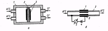 В твердоэлектролитной ячейке камера 1 разделена на две части мембраной 2 из ТЭ (рис. 11, а). На поверхность мембраны нанесены газопроницаемые электроды 3, выполненные из металла, не вступающего в химическое взаимодействие с пробой АГС. С одной стороны мембрана омывается сравнительным газом с известной концентрацией кислорода, а с другой — пробой АГС. Разность потенциалов между электродами является функцией концентрации кислорода в пробе АГС.