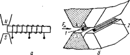 а — с внутренней конвекцией; б — с внешней конвекцией: 1 — термоанемометр, расположенный под магнитными полюсами; 2 — термоанемометр, расположенный под ложными немагнитными наконечниками