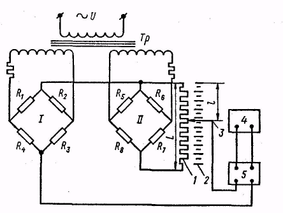 В газоанализаторе в качестве измерительной схемы использованы два моста: рабочий I и сравнительный II.