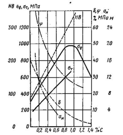 Решающее влияние на механические свойства в углеродистых сталях оказывает содержание углерода (рис. 2). При увеличении содержания углерода повышаются прочность, твердость и износоустойчивость, но понижаются пластичность и ударная вязкость, а также ухудшается свариваемость.